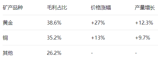 价量齐升,金价上涨27%带动毛利增长,铜产量增长9.7%至48万吨。