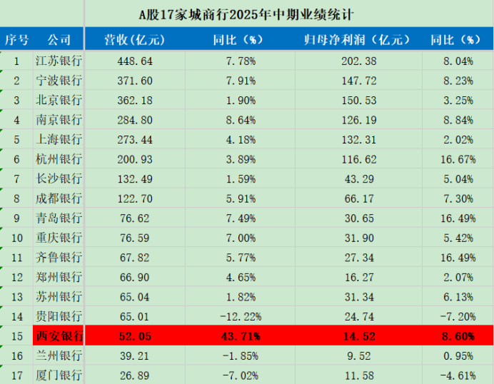 要说西安银行2025年的半年报业绩,可以说是亮眼,甚至放在A股17家城商行中也是显眼的存在。