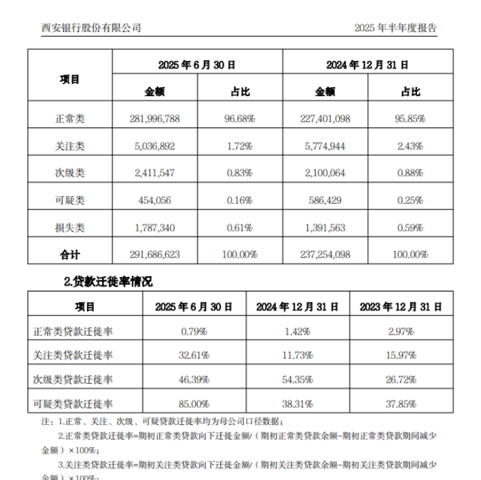 此外,作者发现,西安银行的贷款质量也有所好转。贷款五级分类中,正常类贷款占比从年初的95.85%上升到今年6月底的96.68%,其中关注、次级、可疑类贷款的占比均有所减少。在贷款迁移率方面,正常类贷款、次级类贷款的迁徙率较年初均有较大幅度改善。