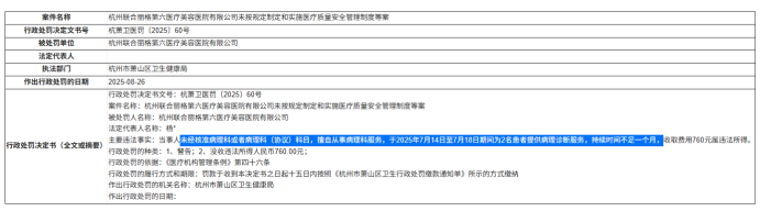 今年8月份,北京新氧科技有限公司持股49%的杭州联合丽格第六医疗美容医院有限公司因未经核准病理科或者病理科(协议)科目,擅自从事病理科服务,于2025年7月14日至7月18日期间为2名患者提供病理诊断服务,被卫生部门予以查处。