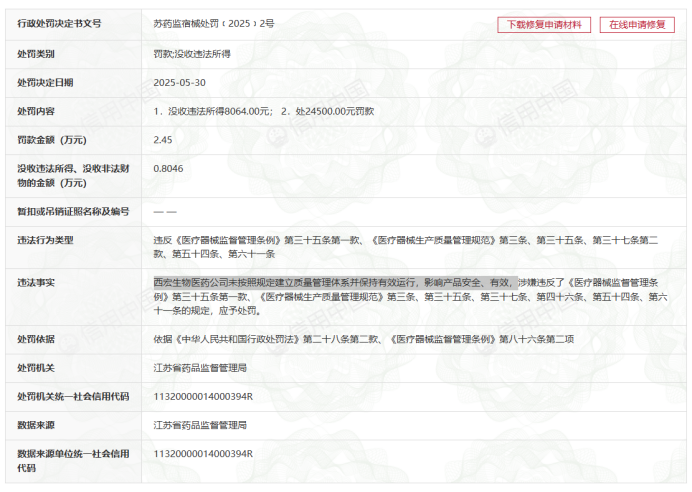 就在今年5月份因未按照规定建立质量管理体系并保持有效运行,影响产品安全、有效,涉嫌违反《医疗器械监督管理条例》等多项规定被江苏省药品监督管理局立案处罚。
