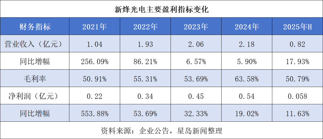 2021年-2024年,新烽光电分别录得营业收入1.04亿元、1.93亿元、2.06亿元、2.18亿元,而随着规模增长,增长幅度出现了逐步放缓迹象。但尽管如此,毛利率方面公司仍维持在50%以上水平,2024年达到近年新高,为63.58%。