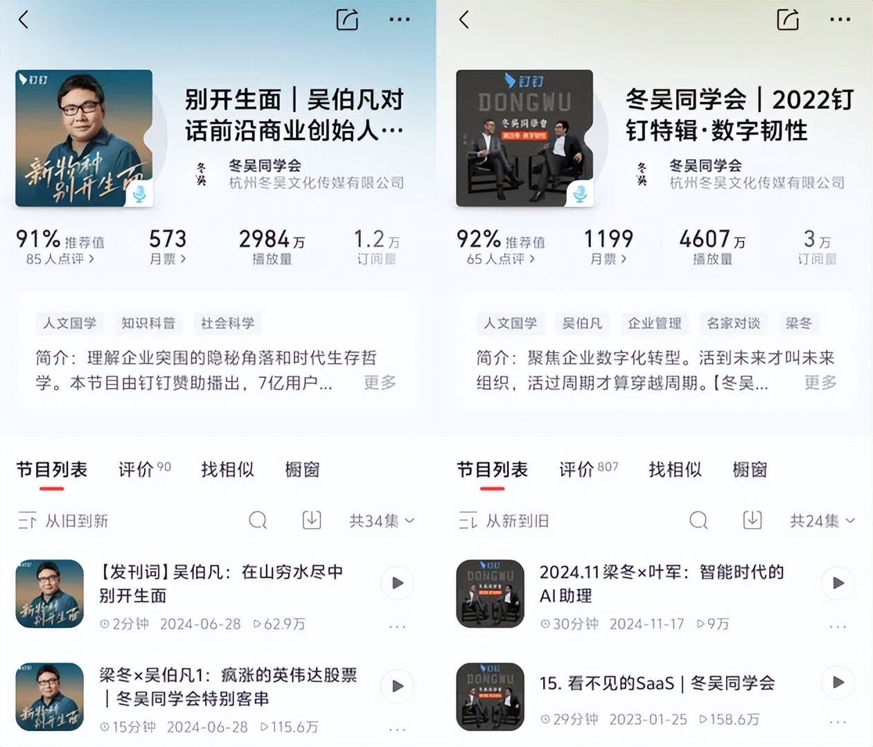 钉钉就看准了播客用户更愿意花时间学习新知识的特点。去年和喜马拉雅合作围绕“企业数字化转型”的主题打造了《数字韧性》特辑节目,总播放量达到4480万;今年则围绕经济复苏周期内的企业创新问题,与商业思想家吴伯凡合作定制品牌播客第二季,传递钉钉在AI创新等领域的成果。