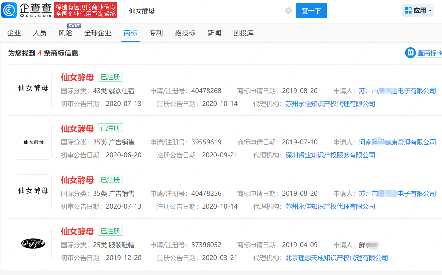 企查查APP显示,“仙女酵母”已被多方申请注册为商标,申请方包括苏州某电子公司、河南某健康管理有限公司、自然人鲜某等,国际分类包括餐饮住宿、广告销售等。