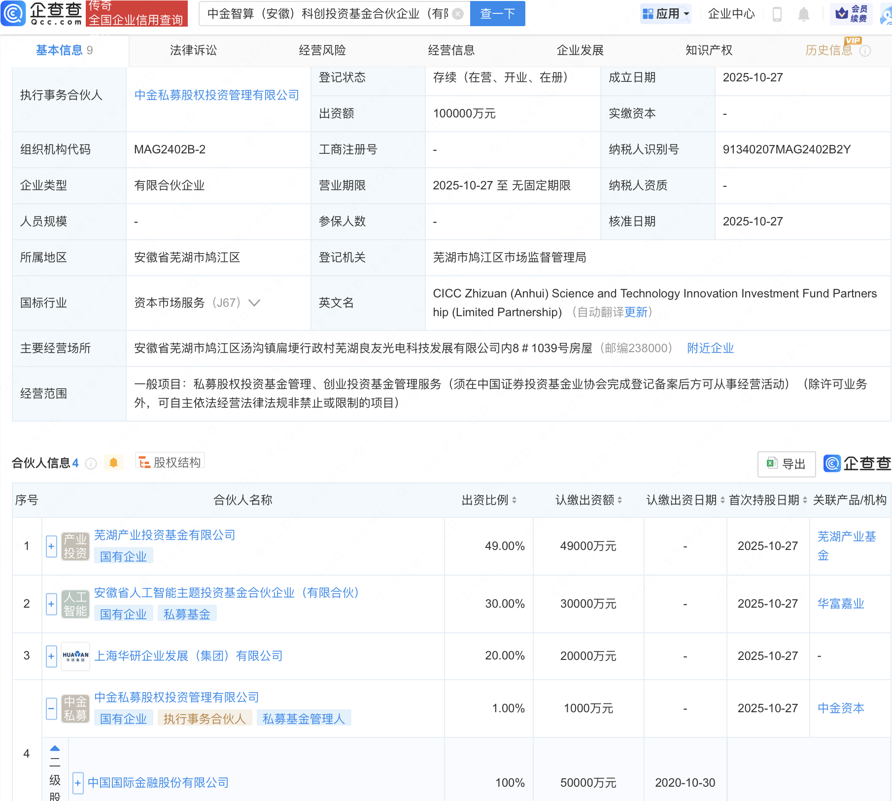 企查查APP显示,近日,中金智算(安徽)科创投资基金合伙企业(有限合伙)成立,出资额10亿元,经营范围包含:私募股权投资基金管理、创业投资基金管理服务。企查查股权穿透显示,该企业由中金公司(601995)全资子公司中金私募股权投资管理有限公司等共同出资。