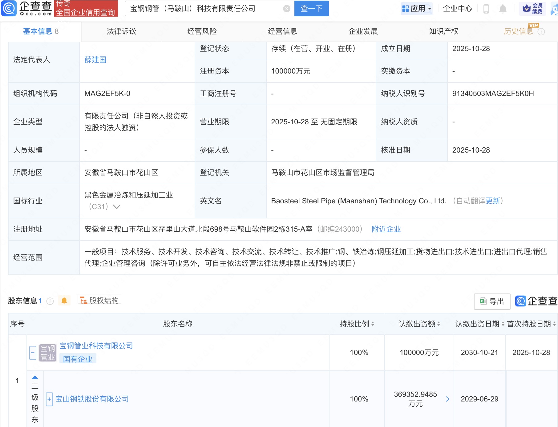 企查查APP显示,近日,宝钢钢管(马鞍山)科技有限责任公司成立,法定代表人为薛建国,注册资本10亿人民币,经营范围包括钢、铁冶炼,钢压延加工,货物进出口等。企查查股权穿透显示,该公司由宝钢管业科技有限公司全资持股,后者为宝钢股份(600019)全资子公司。