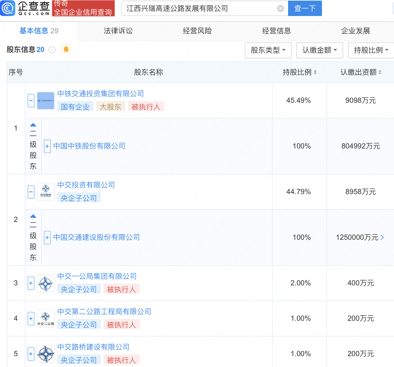 企查查APP显示,近日,江西兴瑞高速公路发展有限公司成立,注册资本2亿元,经营范围包含:公路管理与养护,餐饮服务,住宿服务,建设工程施工等。企查查股权穿透显示,该公司由中国中铁(601390)全资子公司中铁交通投资集团有限公司、中国交建(601800)全资子公司中交投资有限公司等共同持股。