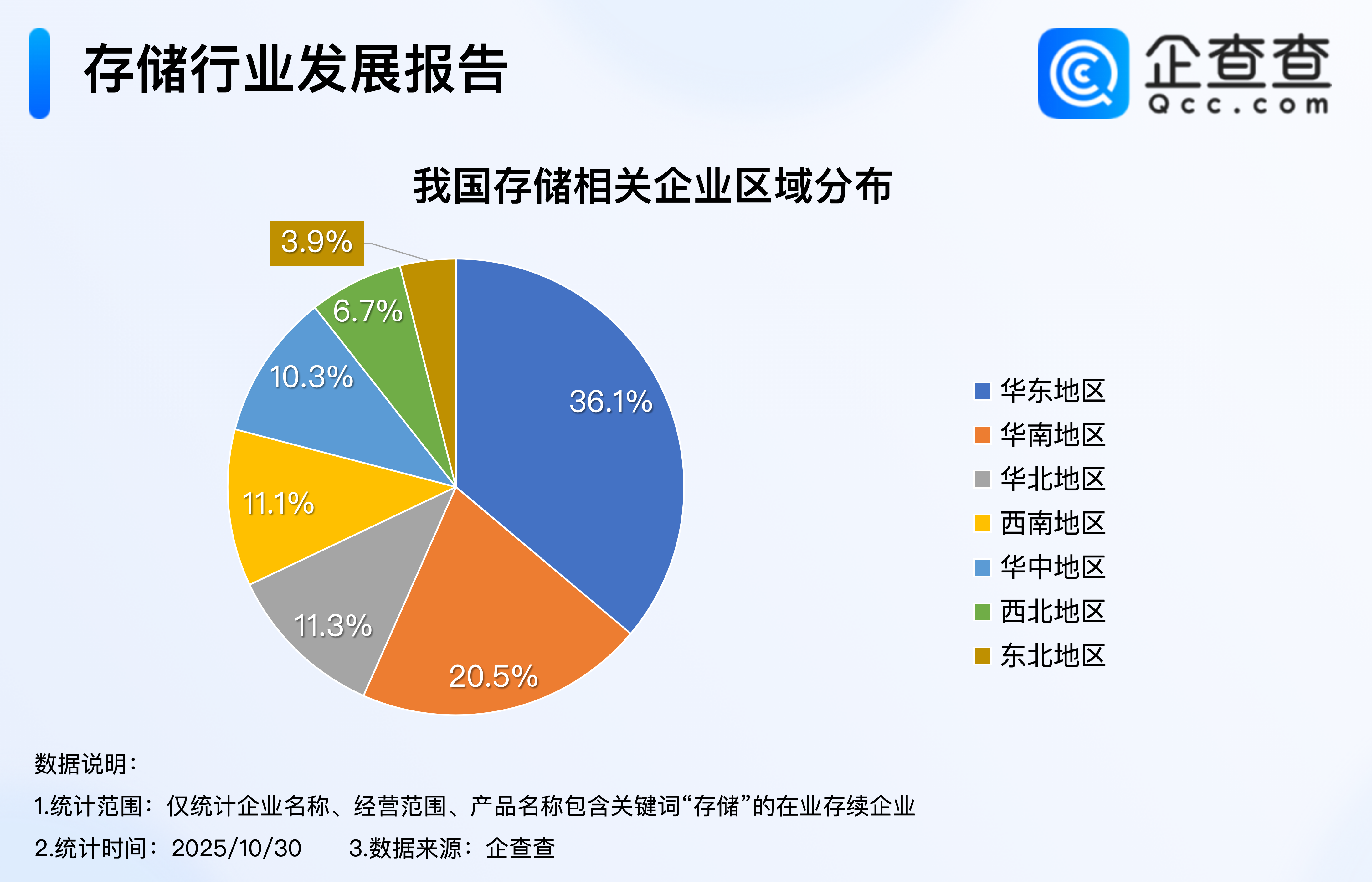 企查查数据显示,截至10月30日,2025年我国已注册23.4万家存储相关企业,已超2024年全年,相比2024年同期增加25.6%;与此同时,近年来我国存储相关企业存量逐年稳步增加,现存量已超120万家;区域分布上,我国现存的存储相关企业集中华东、华南地区,其中华东地区占比36%。