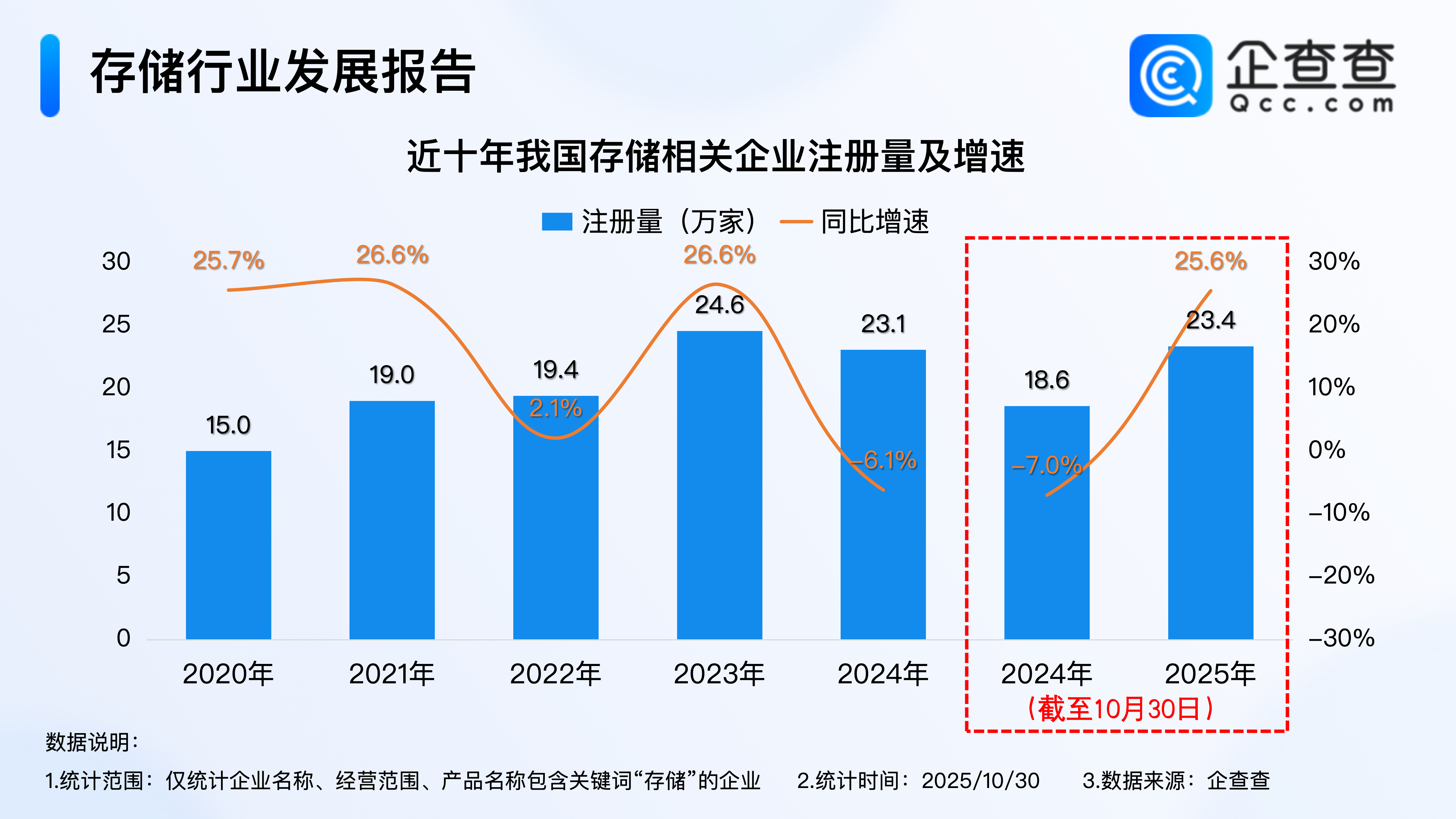 企查查数据显示,近年来,我国存储相关企业注册量基本逐年增加,2023年我国累计注册24.6万家存储相关企业,同比增长26.6%,是2020年同期的1.6倍。截至10月30日,2025年我国已注册23.4万家存储相关企业,已超2024年全年,相比2024年同期增加25.6%。