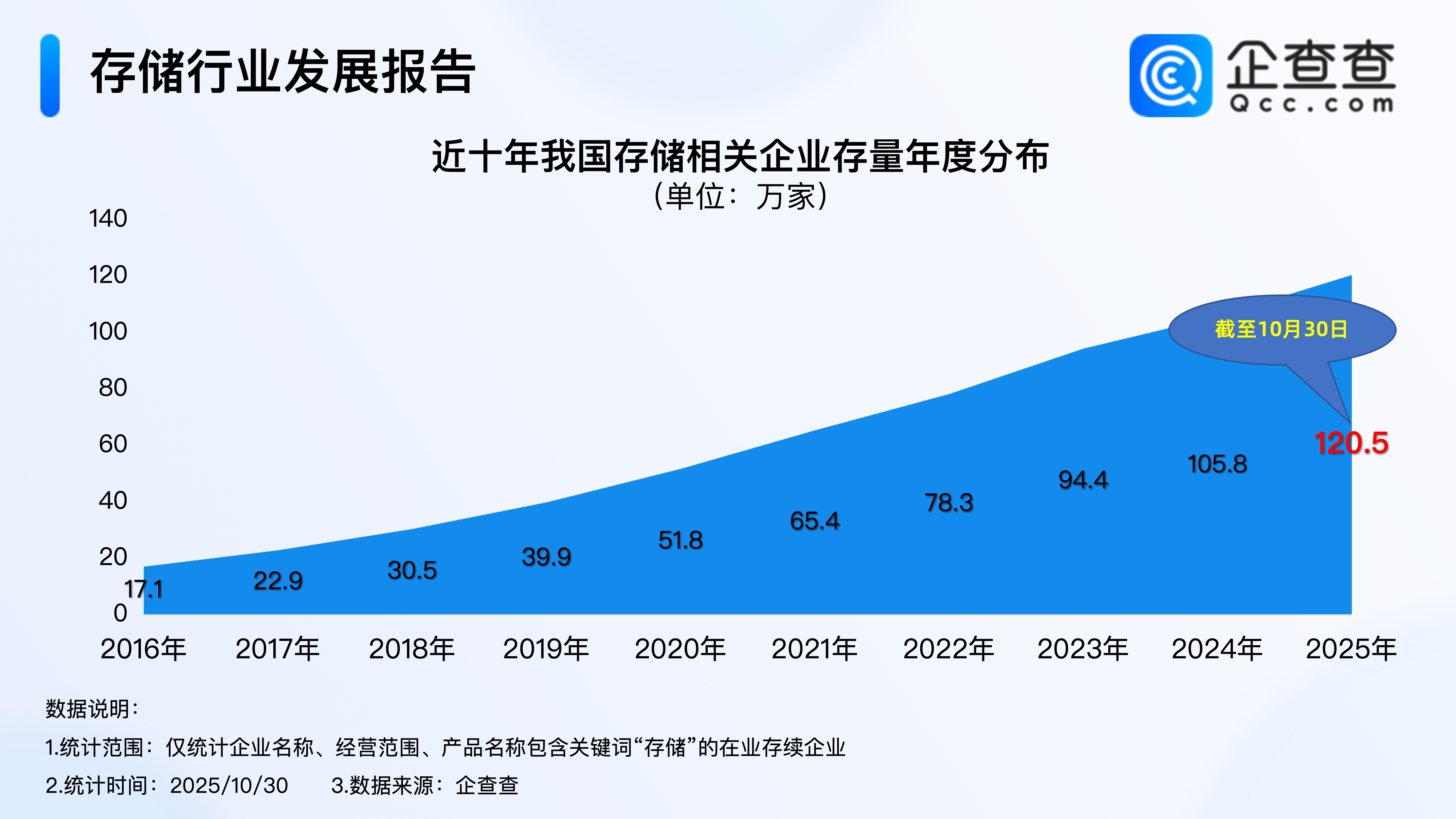 根据企查查数据,我国存储相关企业存量逐年稳步增加,分别于2020年、2024年首次突破50万家、100万家,截至2025年10月30日,我国存储相关企业存量超120万家,达120.5万家。