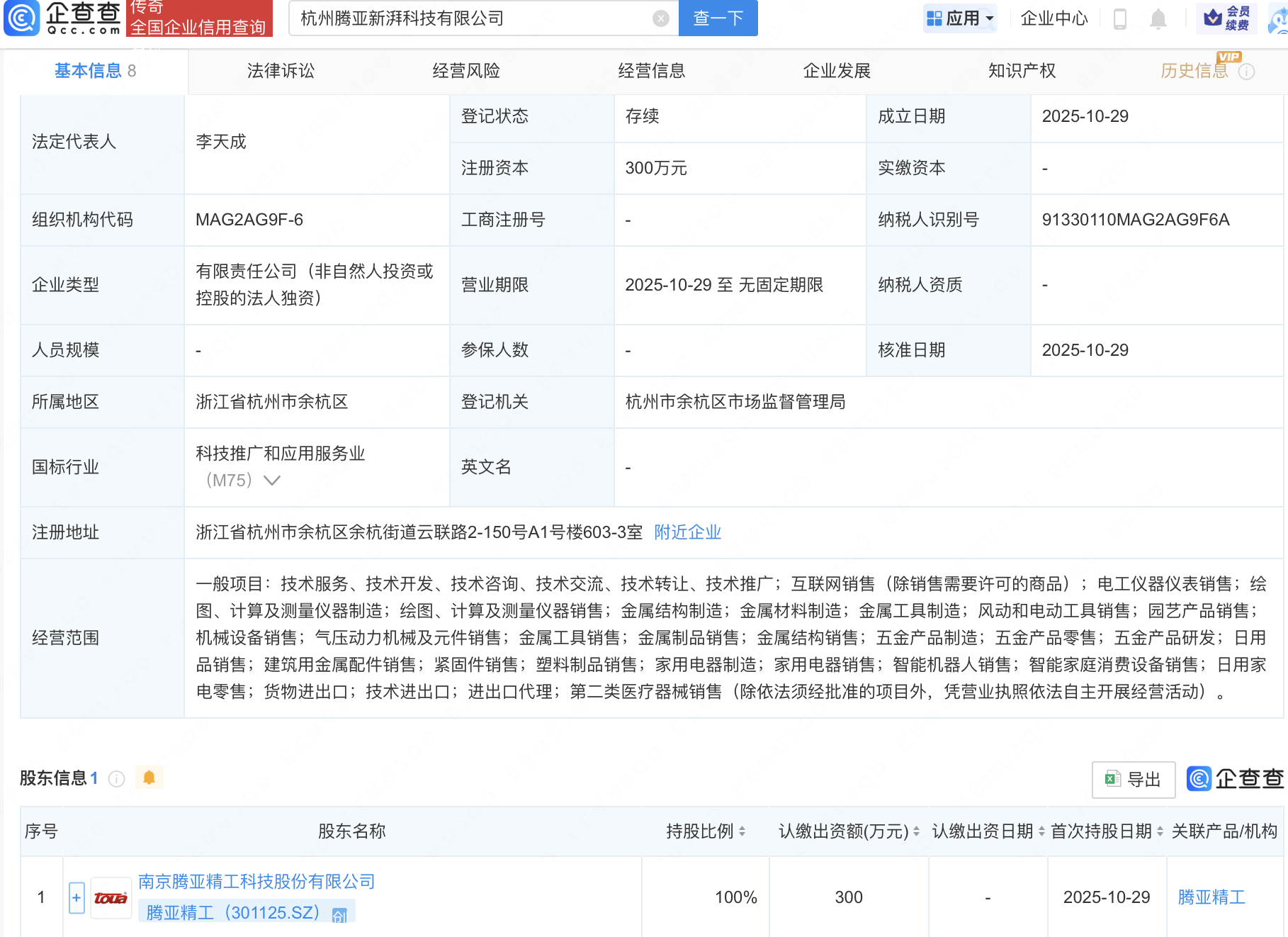 企查查APP显示,近日,杭州腾亚新湃科技有限公司成立,法定代表人为李天成,经营范围包含:家用电器制造;家用电器销售;智能机器人销售;智能家庭消费设备销售等。企查查股权穿透显示,该公司由腾亚精工(301125)全资持股。