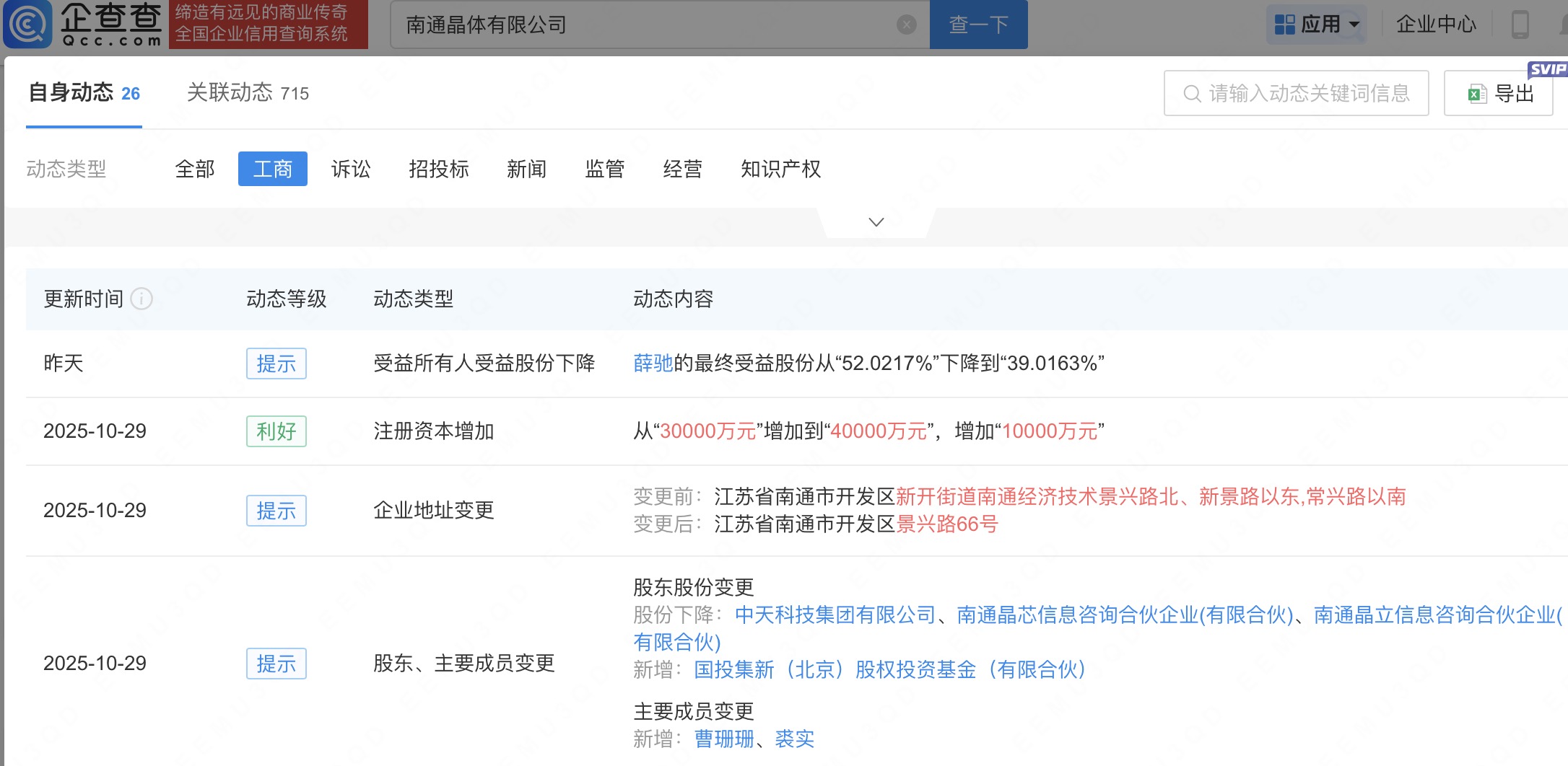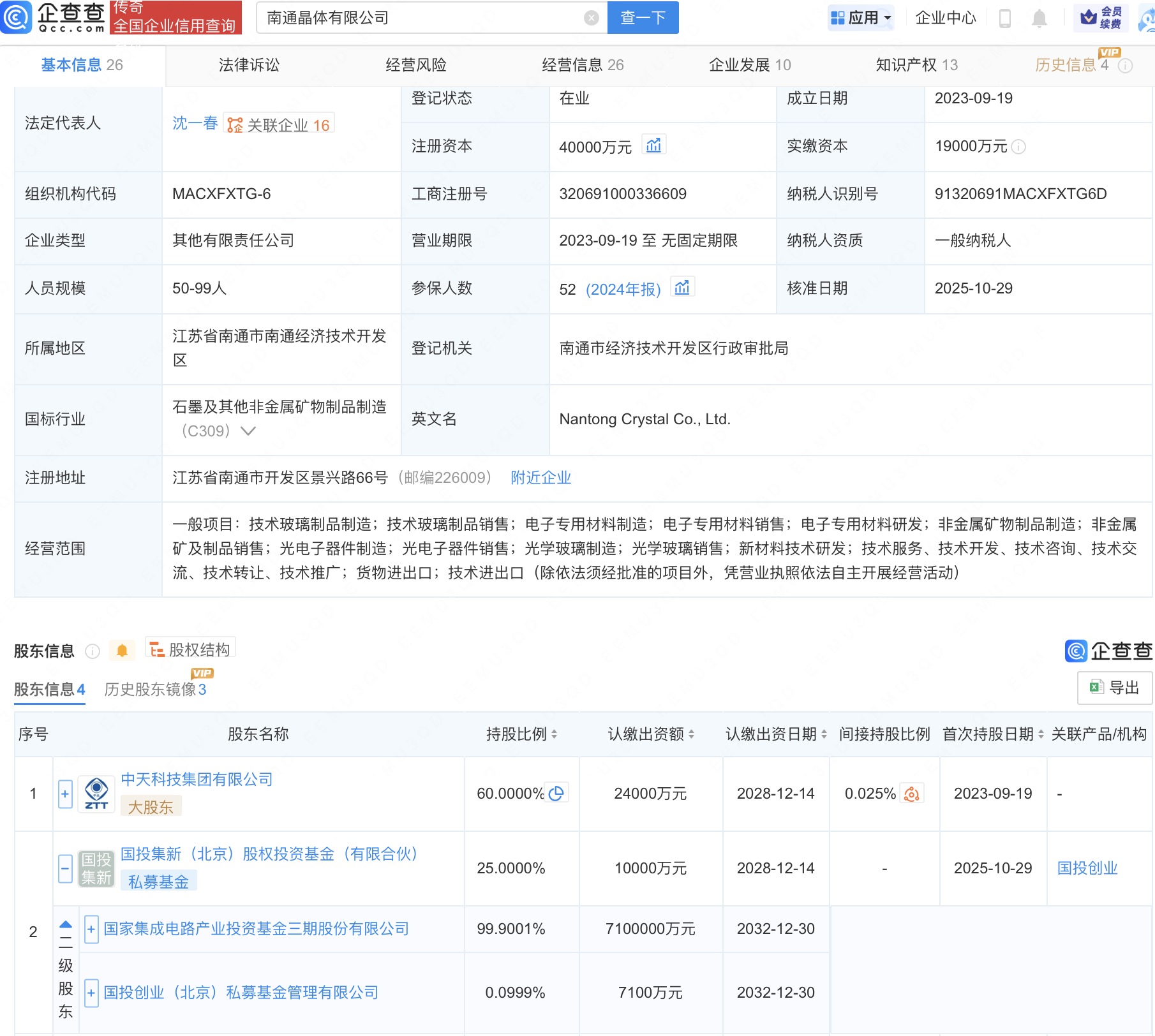 企查查APP显示,近日,南通晶体有限公司发生工商变更,新增国家大基金三期旗下国投集新(北京)股权投资基金(有限合伙)为股东,同时注册资本由3亿人民币增至4亿人民币。企查查信息显示,该公司成立于2023年,经营范围包含:电子专用材料制造;电子专用材料销售;电子专用材料研发等。