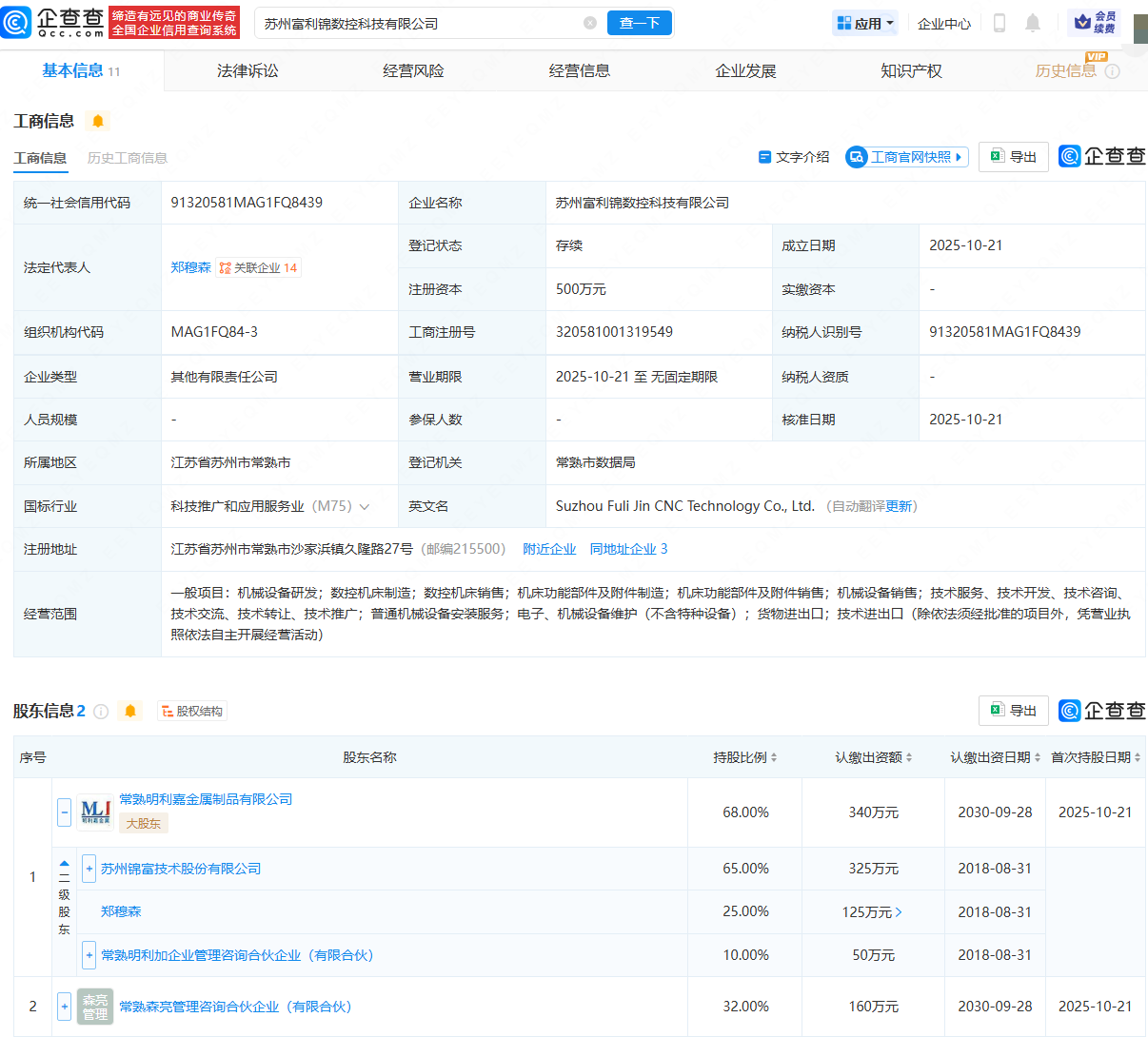 企查查APP显示,近日,苏州富利锦数控科技有限公司成立,法定代表人为郑穆森,经营范围包含:机械设备研发;数控机床制造;数控机床销售;机床功能部件及附件制造;机械设备销售等。企查查股权穿透显示,该公司由锦富技术(300128)控股公司常熟明利嘉金属制品有限公司、常熟森亮管理咨询合伙企业(有限合伙)共同持股。
