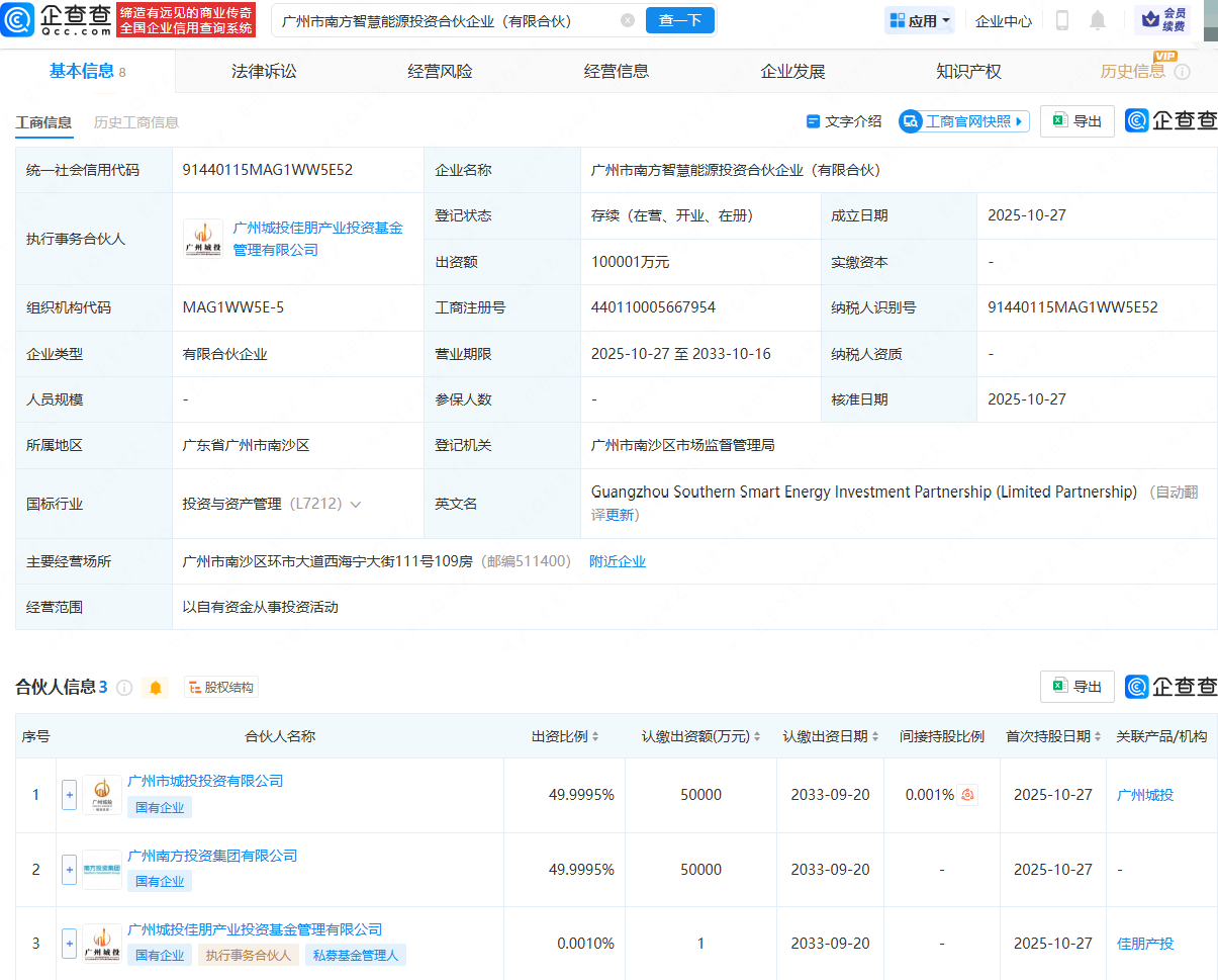 企查查APP显示,近日,广州市南方智慧能源投资合伙企业(有限合伙)成立,出资额约10亿元,经营范围包含:以自有资金从事投资活动。企查查股权穿透显示,该合伙企业由广州市城投投资有限公司、广州南方投资集团有限公司等共同持股。