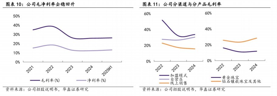 与此同时,自营店的产品结构也经历了战略性优化。公司加大了对于高毛利、高附加值产品(如古法金、钻石镶嵌类产品)的推广与铺货力度。随着产品结构优化,规模效应释放,盈利能力企稳回升,2025年上半年公司净利率为13%,同比增长一个百分点。