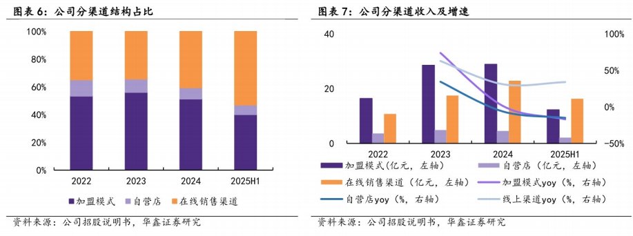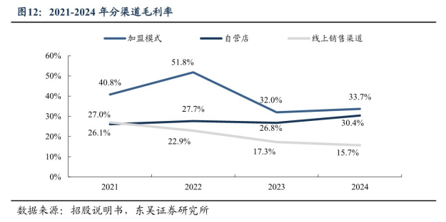 更为关键的是,线上渠道的毛利率从2021年的26.1% 稳步提升至2024年的30.4%,显著高于加盟模式,并逐渐接近自营店水平。说明线上渠道规模效应逐渐显现。