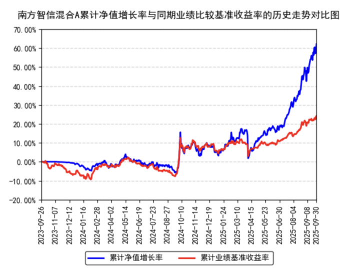 南方智信混合不同阶段的业绩数据,也说明了该策略的有效性,上涨时弹性更佳,下跌时回撤控制更为优秀。南方智信混合第三季度报告显示,截至9月30日,南方智信混合A自成立以来总回报为62.11%,而同期业绩比较基准为24.20%。