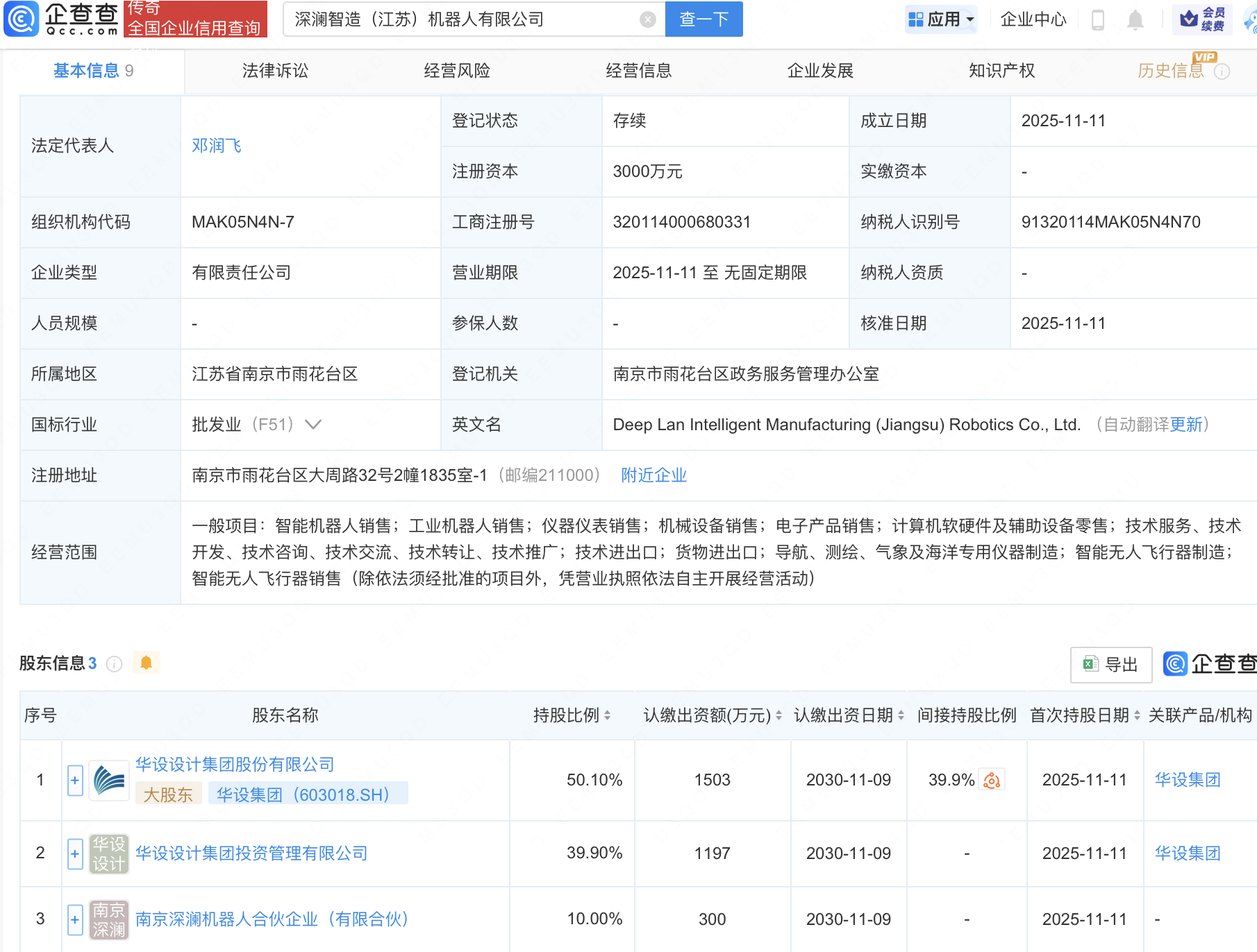 企查查APP显示,近日,深澜智造(江苏)机器人有限公司成立,注册资本3000万元,经营范围包含:智能机器人销售;工业机器人销售;智能无人飞行器制造;智能无人飞行器销售等。企查查股权穿透显示,该公司由华设集团(603018)等共同持股。