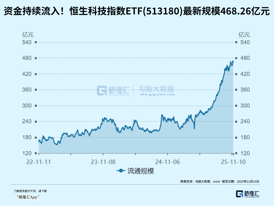 其中,恒生科技指数ETF(513180)近20日吸金47.34亿元,年内资金净买入162.83亿元,最新规模达468.26亿元。