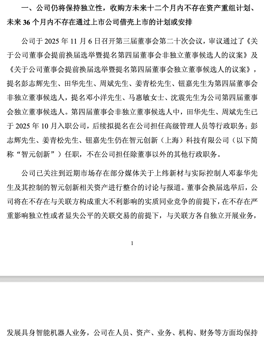 上纬新材在同天发布的股票交易风险提示公告中明确,公司仍将保持独立性,收购方未来十二个月内不存在资产重组计划、未来36个月内不存在通过上市公司借壳上市的计划或安排。上纬新材与关联方各自独立开展业务,发展具身智能机器人业务,公司在人员、资产、业务、机构、财务等方面均保持独立。