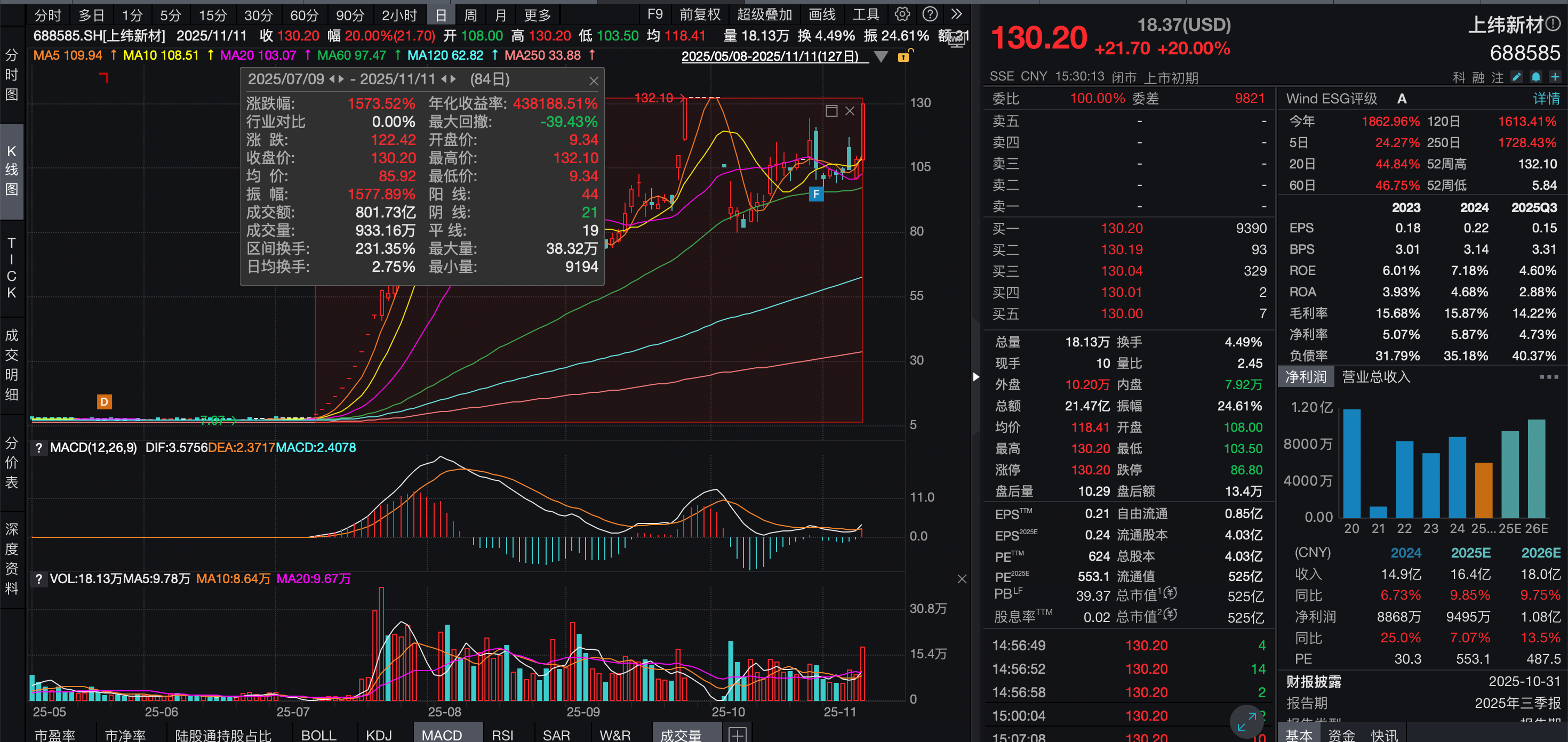 11月11日晚间,上纬新材发布股票交易风险提示公告,股票价格自 2025年7月9日至2025年11月11日累计上涨1573.52%,11月11日再次涨停,短期涨幅显著高于科创综指、科创50及同行业等相关指数涨幅,期间多次触及股票交易异常波动及严重异常波动情形, 股票价格已严重脱离当前基本面,存在随时快速下跌的风险,投资者参与交易可能面临较大风险。