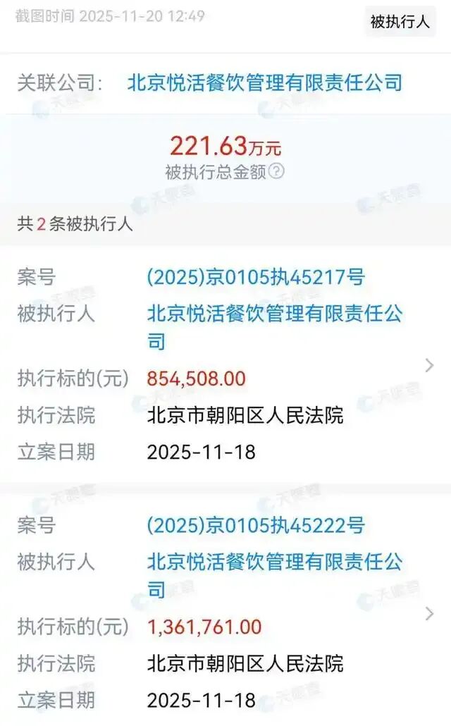 据天眼查最新风险信息显示,Blueglass Yogurt(阿秋拉尕酸奶)关联主体——北京悦活餐饮管理有限责任公司,近日在北京市朝阳区人民法院新增两则被执行人信息,执行标的合计221万余元,其中一案的被执行人还包括其关联公司上海悦活餐饮管理有限责任公司。