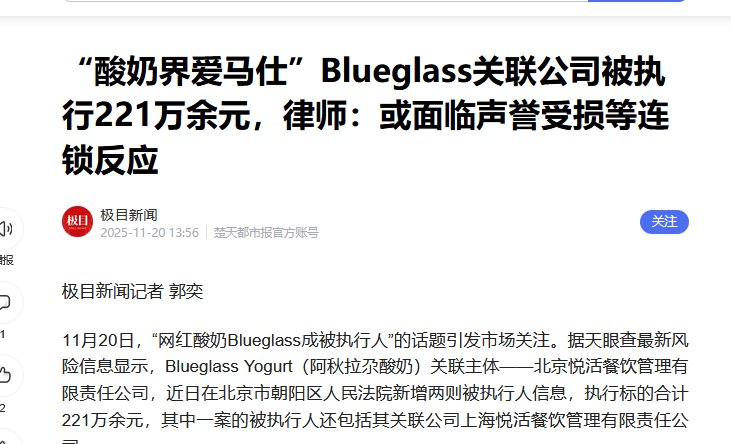 日前,“网红酸奶Blueglass成被执行人”的话题引发了广大网友的关注和热议,国内主流媒体也纷纷给予报道。