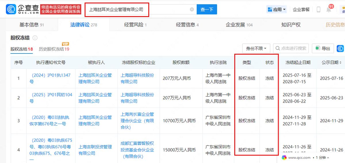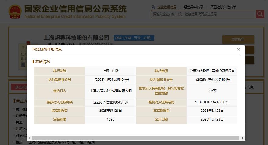 据企信网信息,上海吉联持有的全部上海超导股份被上海市第一中级人民法院冻结,冻结时间截止到2028年。企查查显示该股东近两年来存在多条因纠纷被冻结所持公司股份的情况。