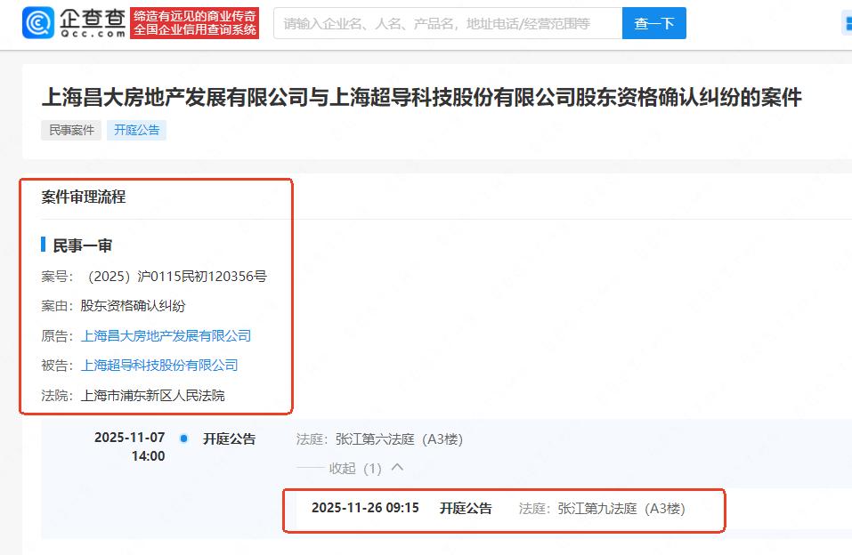 根据企查查,案号为(2025)沪0115民初120356号的《上海昌大房地产发展有限公司(下称:昌大地产)与上海超导股东资格确认纠纷案件》开庭日期为11月26日,昌大地产为原告,上海超导则为被告,承办法院为上海市浦东新区人民法院。对于该起纠纷的具体情况尚无从得知。
