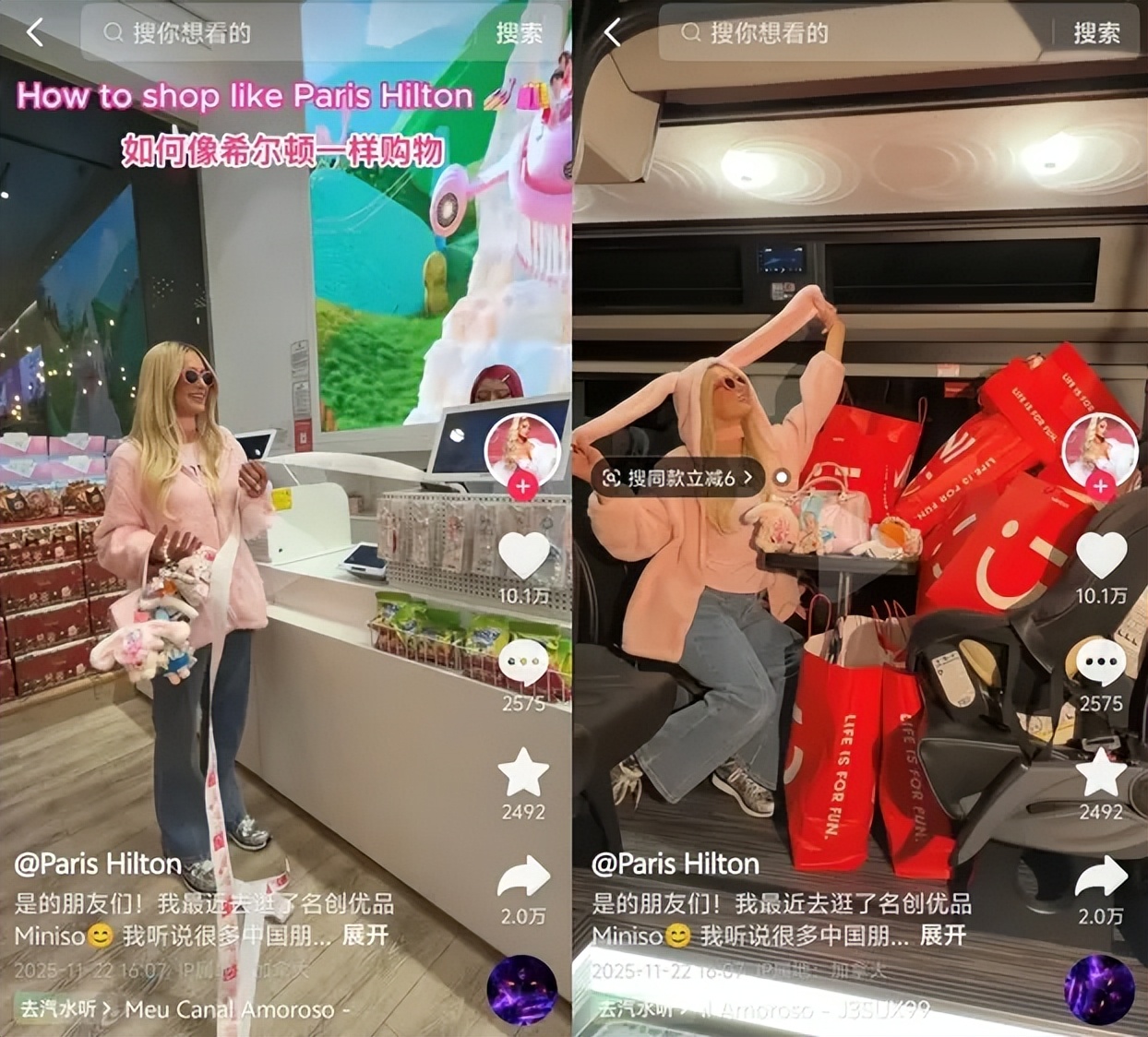 还有很多外国明星,也在MINISO疯狂“买买买”——希尔顿家族成员、名媛帕里斯·希尔顿在MINISO洛杉矶店一次性花了4000美元豪购,小票摊开来比身边一米八的保镖还要高。