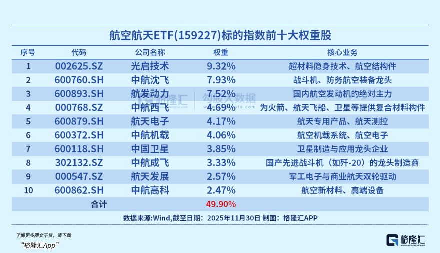 资金坚定抄底航空航天ETF(159227),或正得益于该ETF标的指数国证航天高度契合“空天一体”的战略方向,指数聚焦军工空中力量,与商业航天概念重合度高达57.94%,如中国卫星、航天电子等前十大权重股均深度参与到卫星制造、卫星测控等商业航天关键环节,光启技术的隐身材料、中航高科的复合材料等技术也可应用于卫星、运载火箭的轻量化、高性能制造环节。