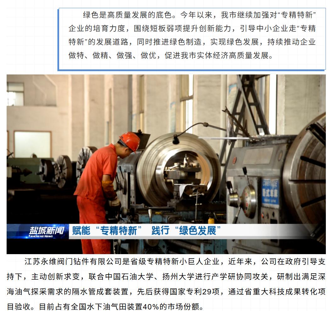 浏览公开信息发现,2022年9月盐城新闻推文曾提及一家名为“江苏永维阀门钻件有限公司”的基本情况,推文内容显示江苏永维阀门钻件有限公司联合中国石油大学、扬州大学研制出满足深海油气探采需求的隔水管成套装置,拥有29项国家专利,通过省级重大科技成果转化项目验收,截至当时“占有全国水下油气田装置40%的市场份额”。
