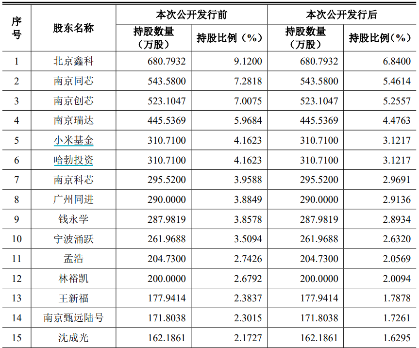 据招股书,截至IPO上市前,小米与华为关联投资机构小米基金和哈勃投资各拥有昂瑞微310.71万股股份,持股比例均为4.1623%。