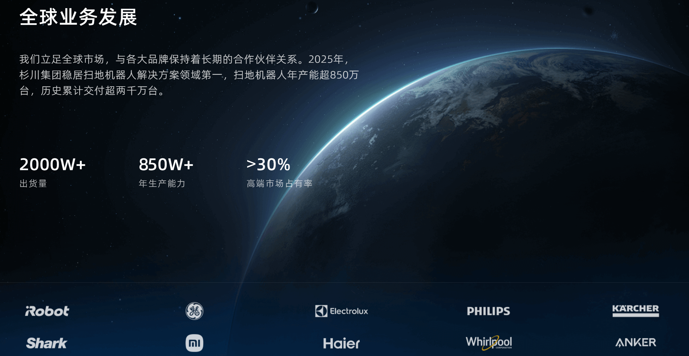 杉川官网显示,这家成立于2016年的公司主营业务之一是扫地机器人解决方案。除了iRobot,官网列出的合作伙伴还有飞利浦、小米、海尔、惠而浦、安克等。2025年,杉川稳居扫地机器人解决方案领域第一,扫地机器人年产能超850万台。