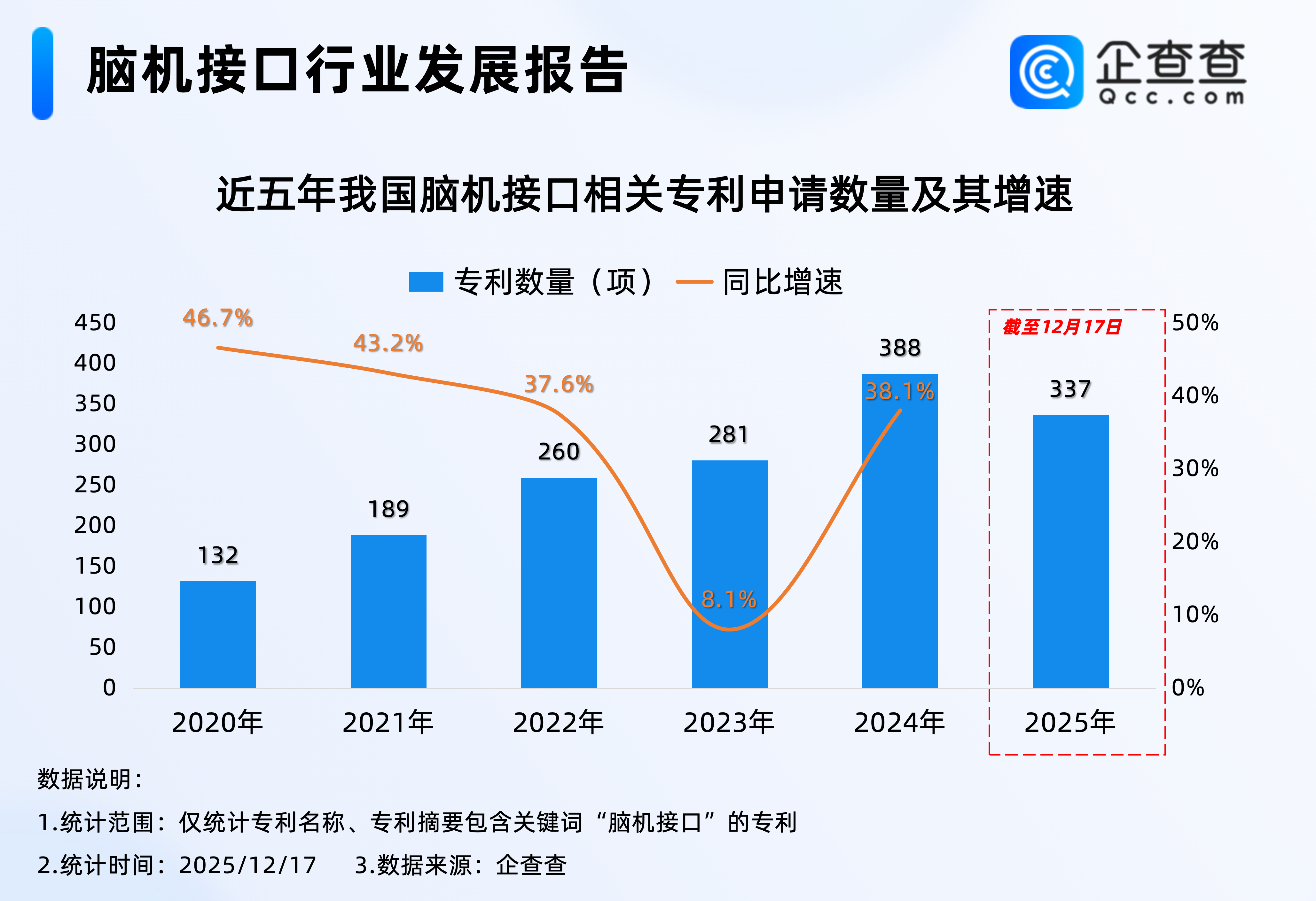 企查查数据显示,2020年以来,我国累计申请1587项脑机接口相关专利,每年专利申请量逐年增加,2024年全年申请388项,创近五年脑机接口相关专利申请量新高。截至12月17日,2025年我国已申请337项脑机接口相关专利。
