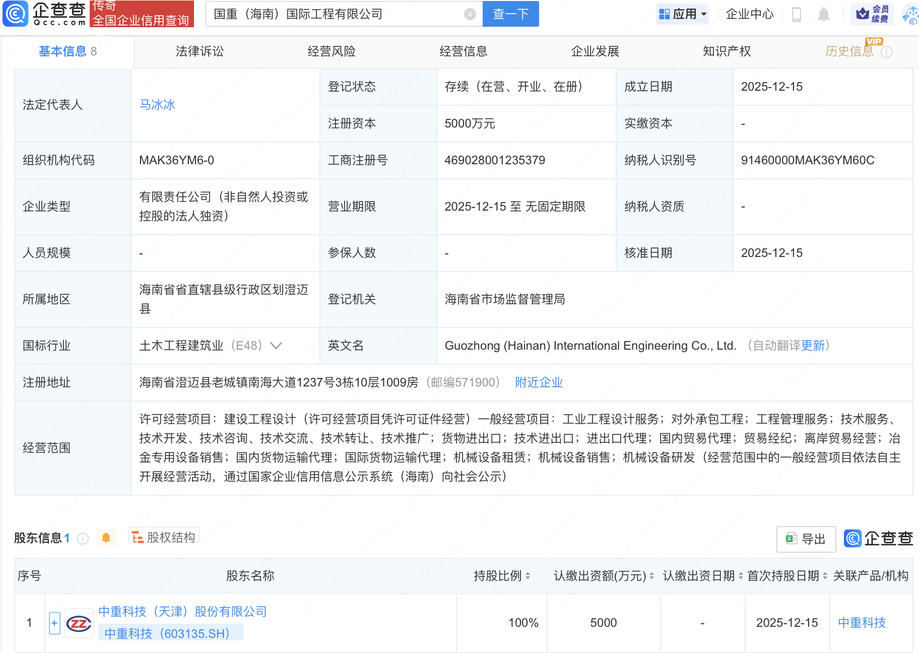 企查查APP显示,近日,国重(海南)国际工程有限公司成立,注册资本5000万元,经营范围包含:国内贸易代理;贸易经纪;离岸贸易经营;冶金专用设备销售等。企查查股权穿透显示,该公司由中重科技(603135)全资持股。