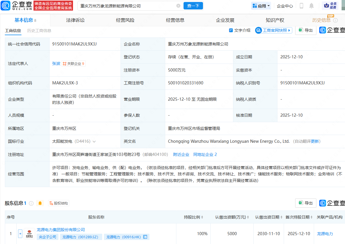 企查查APP显示,近日,重庆万州万象龙源新能源有限公司成立,法定代表人为张波,注册资本为5000万元,经营范围包含:发电业务、输电业务、供(配)电业务;储能技术服务;物联网技术服务等。企查查股权穿透显示,该公司由龙源电力(001289)全资持股。