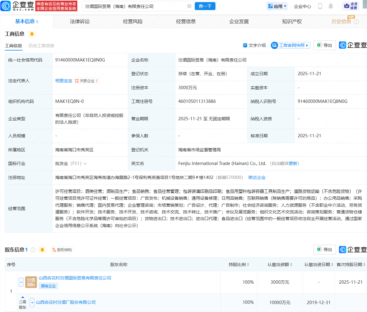 企查查APP显示,近日,汾酒国际贸易(海南)有限责任公司成立,法定代表人为相里宝宝,注册资本为3000万元,经营范围包含:酒类经营;酒制品生产;食品销售;食品经营管理;包装装潢印刷品印刷等。企查查股权穿透显示,该公司由山西汾酒(600809)间接全资持股。