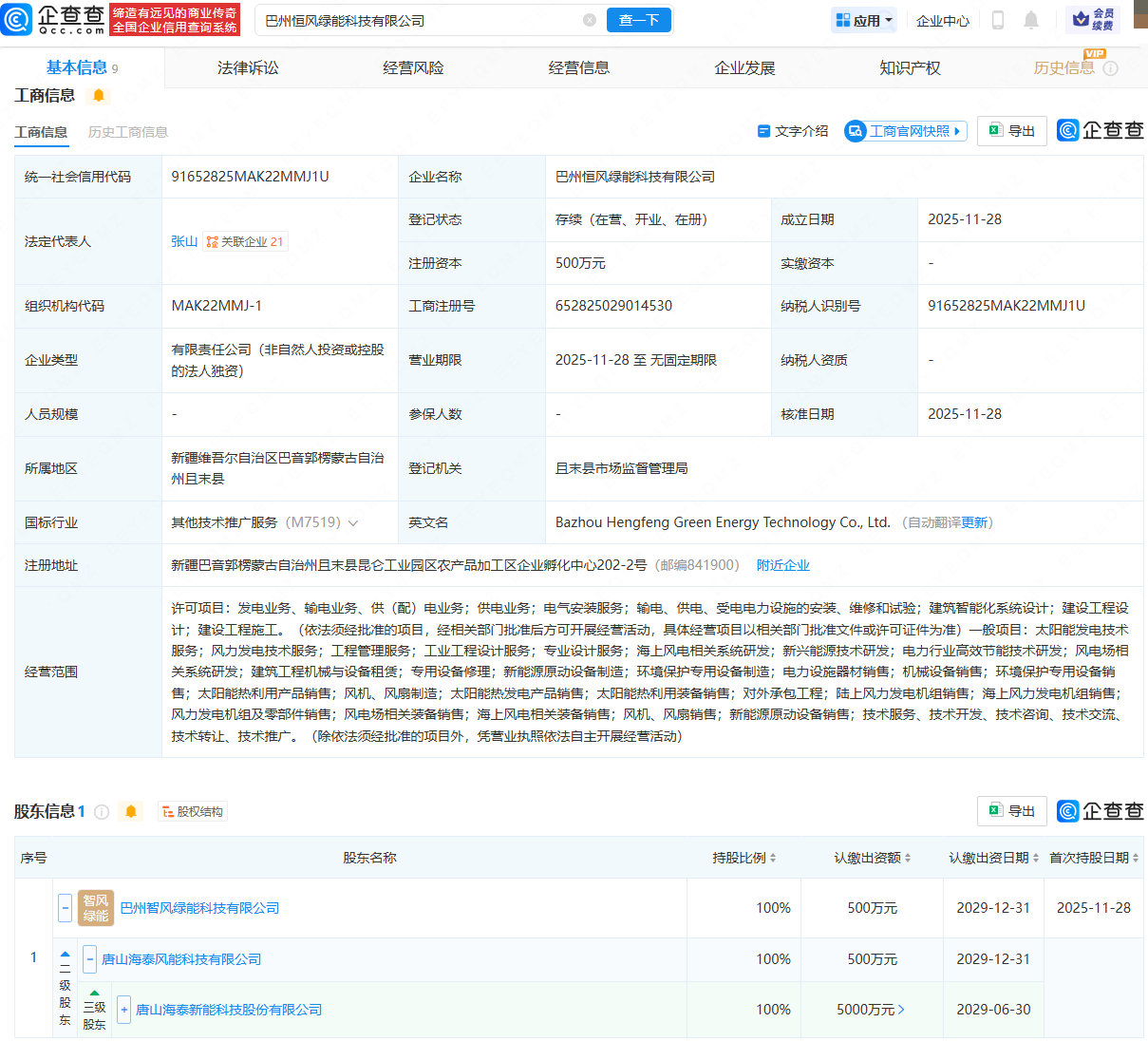 企查查APP显示,近日,巴州智风绿能科技有限公司、巴州恒风绿能科技有限公司成立,法定代表人均为张山,经营范围均包含:发电业务、输电业务、供(配)电业务;供电业务;太阳能发电技术服务;风力发电技术服务等。企查查股权穿透显示,两公司均由海泰新能(920985)间接全资持股。