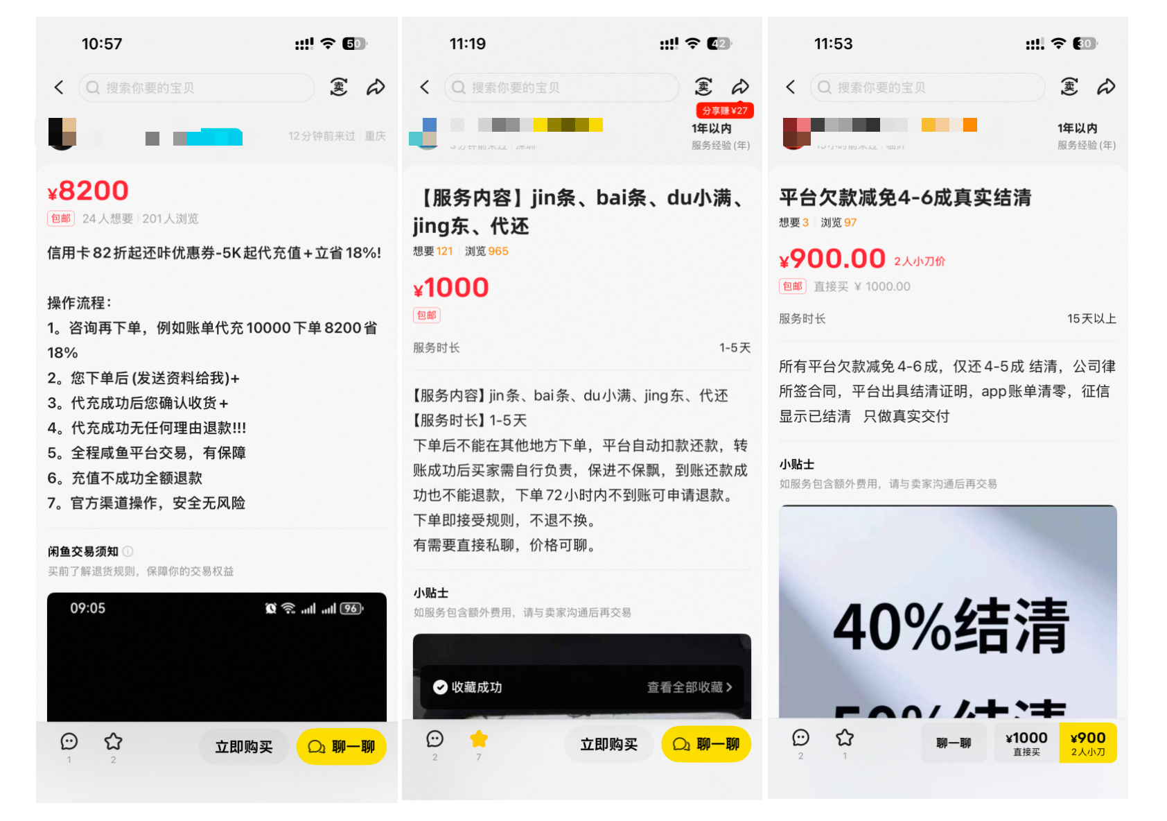 近日,时代周报记者注意到,在闲鱼等二手交易平台,一种以“高折扣还款”为诱饵的灰色服务悄然蔓延。“还款优惠券”“信用卡82折起还卡优惠券”“平台欠款减免4-6成真实结清”等极具诱惑力的广告,吸引着大量深陷债务泥潭的借款人。