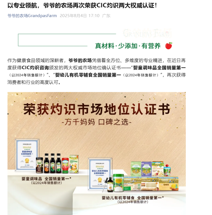 2025年8月,爷爷的农场高调宣布斩获CIC灼识咨询颁发的两大“全国销量第一”证书——“婴童调味品全国销量第一(以2024年销售额计)”和“婴幼儿有机零辅食全国销量第一(以2024年销售额计)”,并在官方公众号宣称“再次获得消费者和行业的高度认可”。