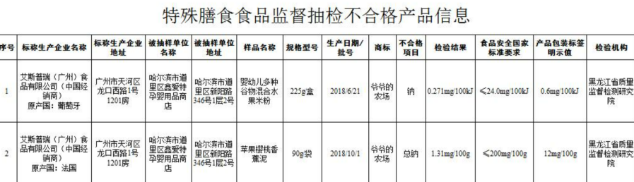 最早的不合格记录可追溯至2019年6月,国家市场监管总局通报显示,爷爷的农场两款进口产品——婴幼儿多种谷物混合水果米粉(原产国葡萄牙)和苹果樱桃香蕉泥(原产国法国),钠和总钠检出值分别仅为标签明示值的45.2%和10.9%,远低于国标规定的"不得低于标签明示值80%"的要求。