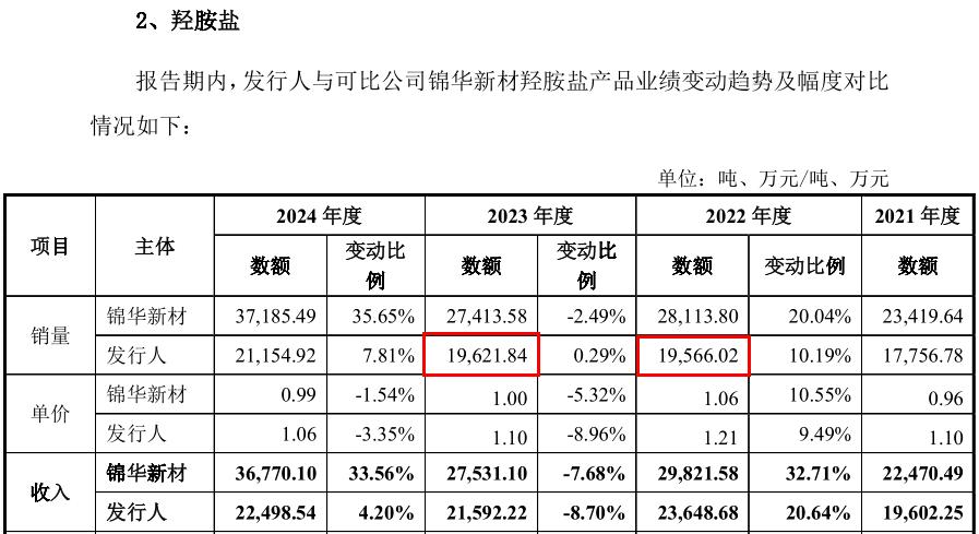 由于硫酸羟胺是艾科维另一产品丙酮肟的原料,所以部分硫酸羟胺存在自用的情况。根据招股书,从硫酸羟胺、盐酸羟胺报告期内的产销情况来看,2022年至2023年,硫酸羟胺的销量(包括内部领用量)分别为11,596.59吨、10,848.70吨,盐酸羟胺的销量分别为8,587.04吨、9,218.42吨,故羟胺盐的合计销量(包含内部领用量)分别为20,183.63吨、20,067.12吨。同时,招股书还披露,2022年和2023年羟胺盐的折纯销量(不含自用量)分别为19,566.02吨、19,621.83吨。招股书披露的羟胺盐折纯销量与首轮问询回复第166页披露的销量数据一致,但首轮问询回复第72页披露的羟胺盐销量既不是包含自用的销量数据,也不是剔除自用的销量数据。