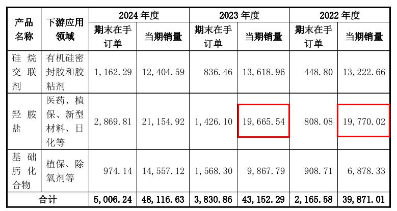 艾科维生产的产品主要包括肟型硅烷、羟胺盐和基础肟化合物三类,其中羟胺盐产品包含硫酸羟胺、盐酸羟胺两类。首轮问询回复第72显示,艾科维2022年和2023年的羟胺盐销量分别为19,770.02吨、19,665.54吨。首轮问询回复第166页显示,2022年和2023年羟胺盐的销量分别为19,566.02吨、19,621.84吨。前后两处地方披露的销售数据存在差异。