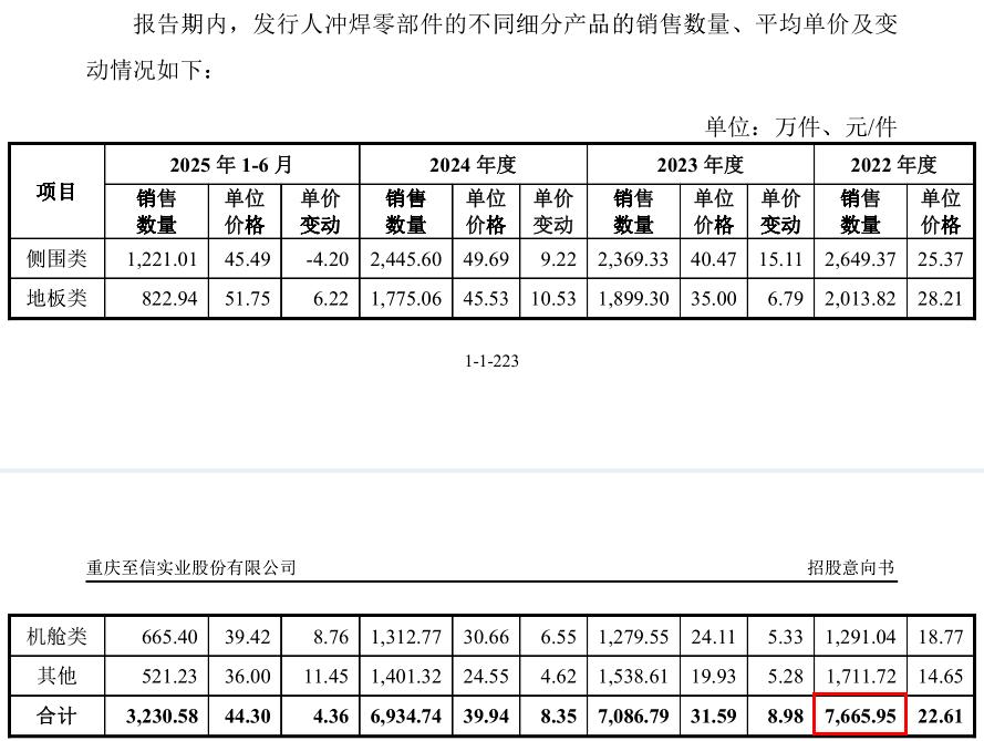 根据招股书第139页,至信股份列表分析报告期内冲焊零部件产品的销量和单价变化,2022年至2025年1-6月的产品销量分别为7,666.11万件、7,086.79万件、6,934.74万件、3,230.58万件,单价分别为22.61元/件、31.59元/件、39.94元/件、44.30元/件。而招股书第223页显示,至信股份又按照侧围类、地板类、机舱类、其他类四类冲焊零部件产品来分析各年度的销量及单价变动情况,2022年至2025年1-6月,四类冲焊零部件产品的各期合计销量分别为7,665.95万件、7,086.79万件、6,934.74万件、3,230.58万件。招股书两处地方披露的2022年的冲焊零部件销量相差了0.16万件,但各期的销售单价则完全一致。