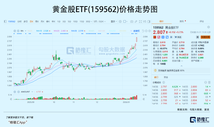 黄金大牛市下,黄金股ETF(159562)今日涨5.73%,今年以来的近13个交易日累计涨25.82%,净值续创历史新高。