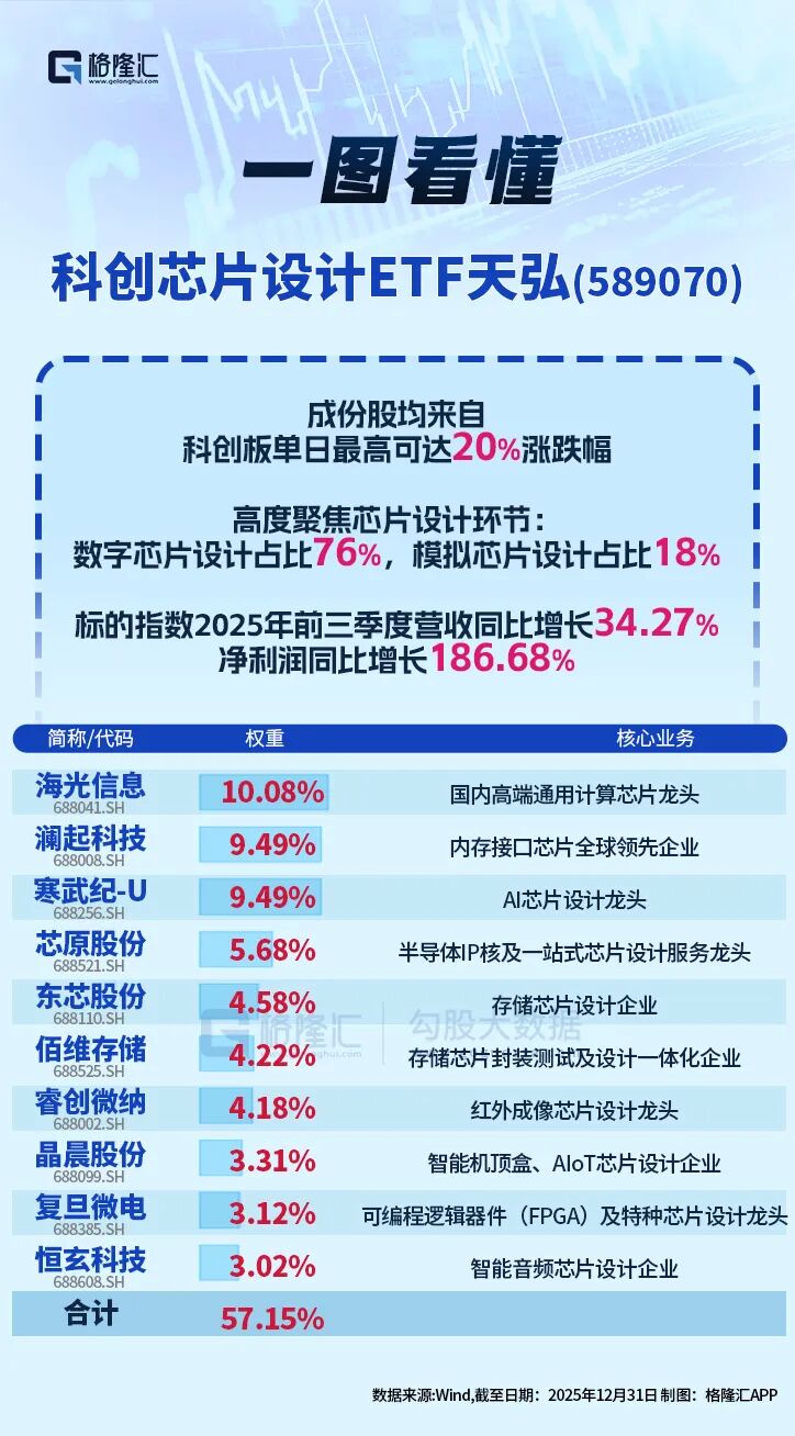 科创芯片设计ETF天弘(589070)标的指数的成份股全部来自科创板,单日涨跌幅上限为20%。相较于传统宽基指数,其价格弹性更高,也更贴近科技成长板块的波动特征。