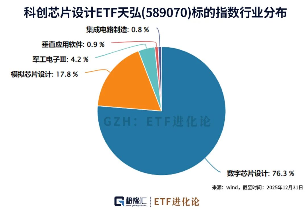 该指数高度聚焦芯片设计环节,是市场上纯正设计主题指数,数字芯片设计占比约76%,模拟芯片设计占比约18%,覆盖AI算力体系中的多个核心方向,包括计算芯片、存储芯片以及关键模拟器件等。