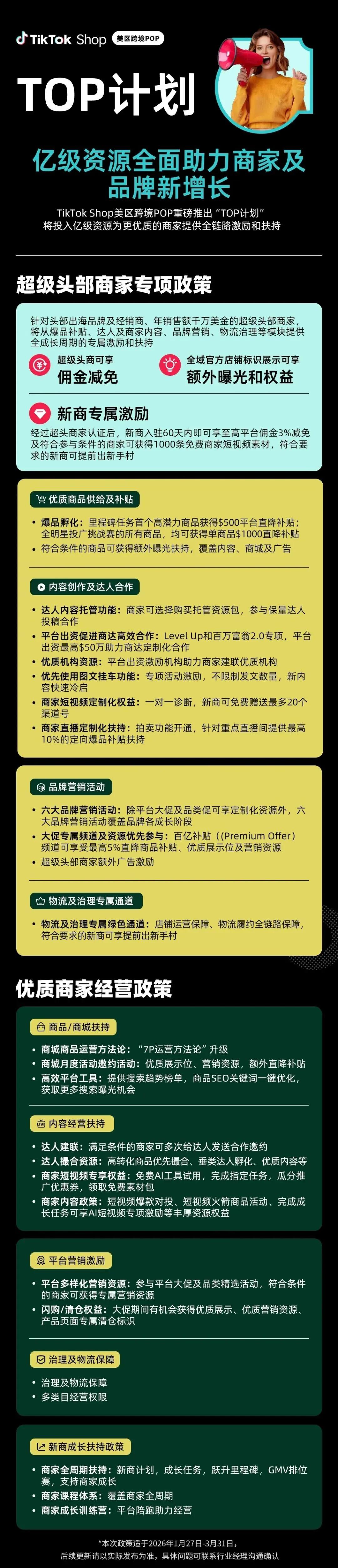 1月27日,TikTok Shop 美区跨境 POP 针对头部出海品牌、经销商以及跨境电商平台千万大商等“超级头部”商家召开私享会,发布「TOP 计划」,计划全年投入亿级资源,为优质商家提供全链路激励扶持,并为“超级头部”商家提供更多资源和权益。显然,TikTok Shop释放了明确的利好信号——从商品、内容、营销和服务等多个维度,进一步提升对头部品牌的长期支持力度,为增长提供更高确定性。