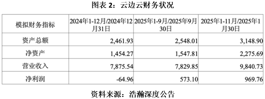 虽然具备良好的业务协同逻辑,但本次并购的高额溢价率亦不容忽视。公告显示,截至2025年11月30日,云边云估值约2.45亿元,收购溢价率高达962%,处于较高水平。若并购效果不及预期,浩瀚深度将面临大额商誉减值的风险。